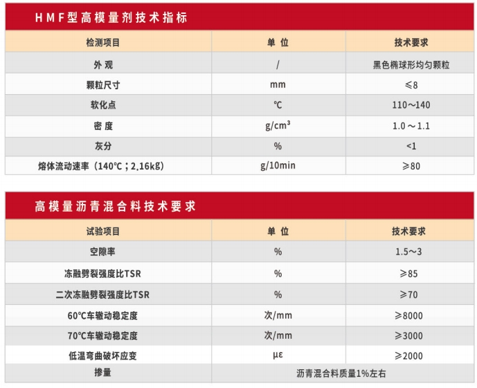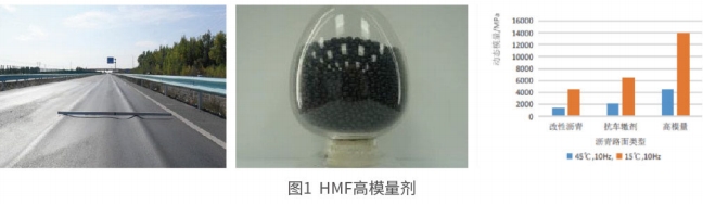 HMF型高模量劑是一種直投式改性劑,該型外加劑加入到瀝青混合料中發生溶脹、產生位阻效應,致使瀝青粘度增大、瀝青混合料粘聚力增強,從而提高混合料的動態模量,對瀝青混合料的抗疲勞性能、耐久性能也有明顯的改善作用。