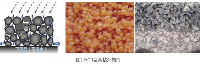 HCR 型高粘外加劑是一種新型直投式瀝青混合料添加劑,通過使用特種聚 合物復合材料,能夠大幅提升其在瀝青基材料中的分散性及“瀝青-集料”界面 間的粘附性。目前成品高粘瀝青60℃粘度在20000Pa · s~50000Pa · s, 遠遠不 能滿足高品質排水路面等功能性路面的需求, HCR 型高粘外加劑可以滿足高性能排水路面指標要求(60℃動力粘度達到400000Pa · s), 方便施工。