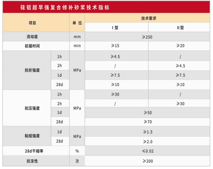 硅鋁超早強復合修補砂漿采用膠凝材料復配技術,輔以高效化學外加劑和優 質骨料等組份,形成一種針對道路等工程搶修搶建的特種高性能水泥基砂漿材 料,可直接鋪裝在病害部位,實現超薄超厚修補,具有超早強、超高強、耐低溫等優良性能,在高速和高壓行車狀態下不會出現破碎和脫落現象。
