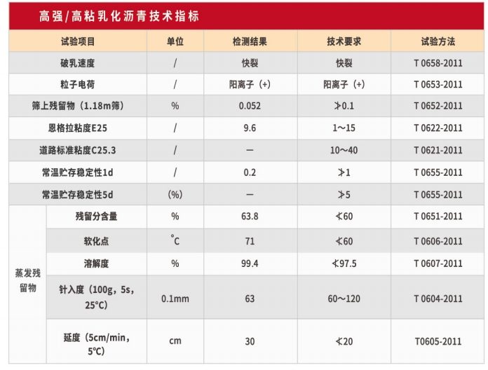 ① 粘結強度高:采用高分子樹脂復合改性,粘結強度遠大于普通乳化瀝青;